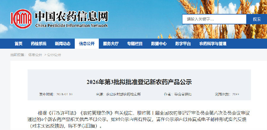 农业农村部于 2026年4月10日下午公示 2026年第3批拟批准登记新农药产品,共计4个,涵盖新农药原药 + 制剂、新农药母药 + 制剂两大类别。所有产品毒性均为微毒或低毒,高度契合绿色农业与减量增效的发展导向。具体产品信息如下: