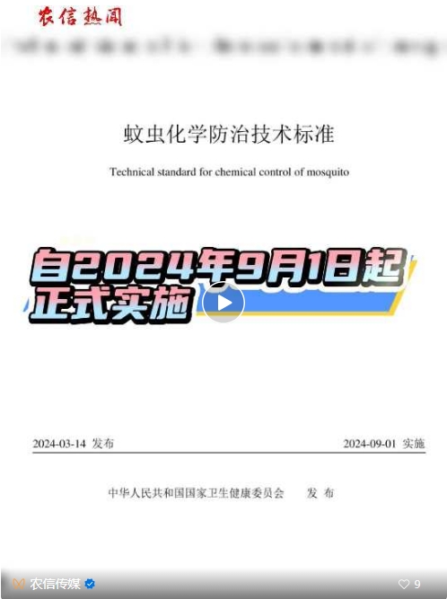 国家卫生健康委批准发布的推荐性卫生行业标准《蚊虫化学防治技术标准》(标准编号:WS/T?832-2024),自2024年9月1日起正式实施。
