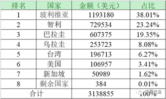 2021年,全球多杀霉素的使用总金额达到3138855美元,使用总量为620.67吨。使用金额排名前3位的国家是玻利维亚、智利及巴拉圭,占比均为19%以上(表1),玻利维亚甚至达到38%以上;使用量排名前3位的国家是玻利维亚、乌拉圭及智利,占比均为12%以上(表2),玻利维亚达到28%以上。