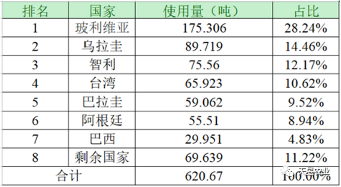 表2 多杀霉素全球市场使用量排名前8位的国家及地区