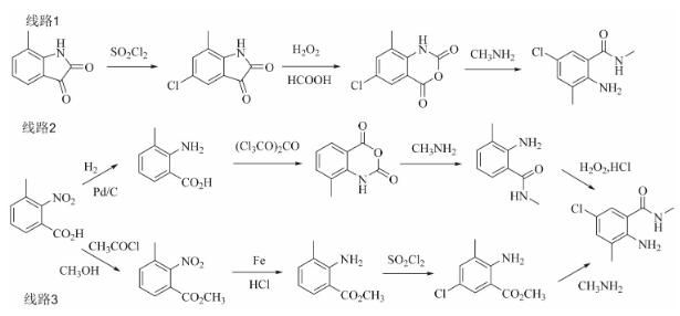 据文献报道,合成2-氨基-5-氯-N,3-二甲基苯甲酰胺的方法主要有以下几种(见图2) :