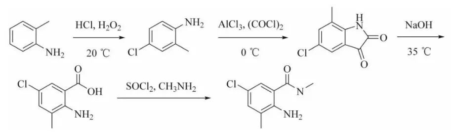 1) 以7-甲基靛红为原料,经氯化亚砜氯化、甲酸-双氧水氧化、甲胺化反应制备2-氨基-5-氯-N,3-二甲基苯甲酰胺,优化工艺条件下,反应总收率为62%;