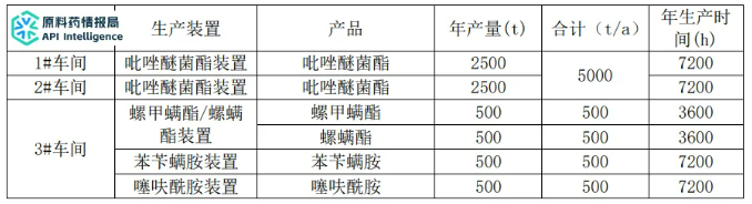 生产规模:拟建工程年产吡唑醚菌酯5000t/a、螺甲螨酯500t/a、螺螨酯500t/a、苯苄螨胺500t/a、噻呋酰胺500t/a,合计农药总产量7000t/a。