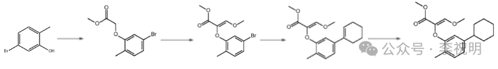 以5-溴-2-甲基苯酚为起始原料,经醚化生成2-(5-溴-2-甲基-苯氧基)乙酸甲酯,然后经Claisen缩合、O-甲基化生成(Z)-2-(5-溴-2-甲基-苯氧基)-3-甲氧基-丙-2-烯酸甲酯(甲氧基丙烯酸酯关键砌块的构建),随后经Suzuki偶联,引入环己烯基,生成(Z)-2-[5-(环己烯-1-基)-2-甲基-苯氧基]-3-甲氧基-丙-2-烯酸甲酯,最后催化加氢反应生成最终产物(Z)-2-(5-环己基-2-甲基-苯氧基)-3-甲氧基-丙-2-烯酸甲酯,即环己菌酯。反应路线如下: