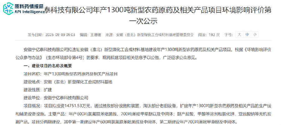 近日,关于安徽宁亿泰科技有限公司年产1300吨新型农药原药及相关产品项目在相关网站一次环评公示。