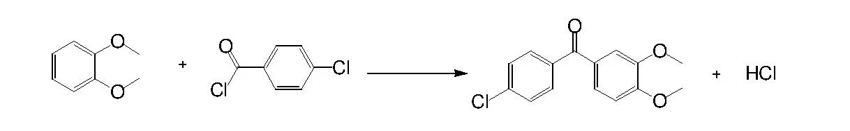 第一步:以100 L中试反应釜(材质搪瓷,设计温度170℃,设计压力-0.1~0.3 Mpa,浆式搅拌,设计转速160 rpm)为示例,以对氯苯甲酰氯和邻苯二甲醚在催化剂作用下,以对氯苯甲酰氯为反应底物的体系,与邻苯二甲醚发生傅克反应,生成4-氯-3′,4′-二甲氧基二苯甲酮和无水氯化氢,反应方程式如下: