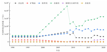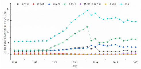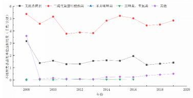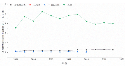 1990-1998年,单位面积除草剂的用量稳定在1.65千克/公顷,1999-2015年,单位面积除草剂的用量持续增长,2015年用量为4.29千克/公顷。但在2016年单位面积除草剂用量下降至3.52千克/公顷,2020年为3.22千克/公顷(图3)。2008-2019年单位面积除草剂用量中,除“其他”类除草剂外,单位面积用量较多的除草剂为苯氧激素类和二硝基苯胺类,三嗪类除草剂只在2008年有记录,为0.087千克/公顷(图5)。