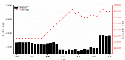 图1 以色列30年耕地总面积和农药总用量变化一览表