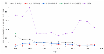 1990-2008年单位面积杀虫剂的用量持续增加,并在2001年超过单位面积除草剂用量排在单位面积农药用量种类第二位。2008年单位面积杀虫剂用量为3.38千克/公顷,随后开始下降,2020年的单位面积杀虫剂用量为1.41千克/公顷,低于单位面积除草剂用量,排在第三位(图3)。2008-2019年单位面积杀虫剂用量中,除“其他”类杀虫剂外,2008-2016年,有机磷类杀虫剂单位面积用量较多,其次为拟除虫菊酯类、氨基甲酸酯类杀虫剂。但2017-2019年,氨基甲酸酯类杀虫剂用量跃至第一位,且有持续增长趋势。有机磷类杀虫剂用量骤降,单位面积用量约为0.050千克/公顷,低于拟除虫菊酯类杀虫剂(图6)。