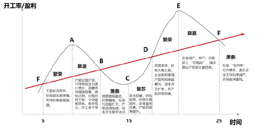 中国化工市场周期理论,是研究化工行业景气度随时间呈现规律性波动的理论体系,核心是供需关系失衡与再平衡的循环过程,表现为价格、盈利、产能利用率等指标的周期性变化。化工行业在很多时候是属于典型的周期性波动行业,波动因素来自供需错配、成本传导、政策干预和宏观经济周期变化等多重因素,市场表现为复苏、繁荣、萧条、衰退循环的特征。