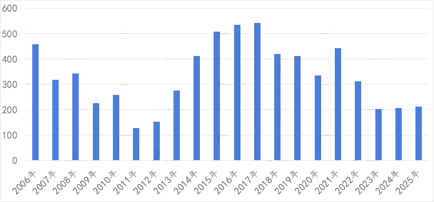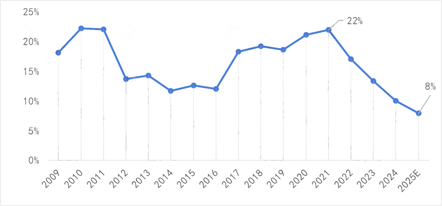 要想确定中国化工产业发展阶段,需要通过理论利润率水平、开工率水平等指标综合去评估。统计了133个化工品在过去16年的理论利润率波动,计算了其平均值,发现2009年至2025年期间内,中国化工行业利润率呈现了两个峰值曲线波动,其中高点在2010年至2011年,以及2020年至2021年。低点出现在2014年至2016年,以及2025年前后。