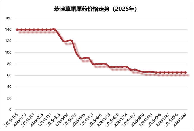 2025年以来,曾被誉为巴斯夫玉米田专利除草剂“王牌”的苯唑草酮原药价格大幅“跳水”,跌入一个全新的价格区间,具体的从年初的140万元/吨骤降至9月的65万元/吨,并以该价格延续至10月下旬。