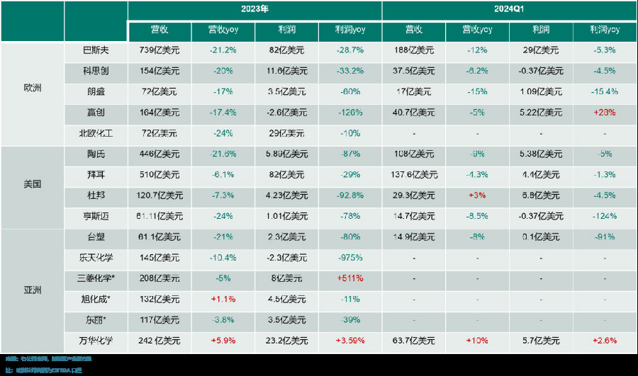据选取的全球15家重要化工巨头业绩来看,2023年全球化工巨头业绩普遍下跌(13/15,占比86.67%)。利润方面,除三菱化学大涨511%,万华化学勉强增长外,其余无一例外大暴跌(13/15,占比86.67%),其中,乐天化学暴跌975%,赢创暴跌126%,杜邦大跌92.8%,台塑跌80%。而从2024年第一季度部分业绩看,情况也并未好转。