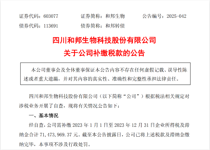 日前,和邦生物公告称,经税务自查,公司需补缴2023年度企业所得税及滞纳金合计7147.40万元,目前已缴纳完毕。