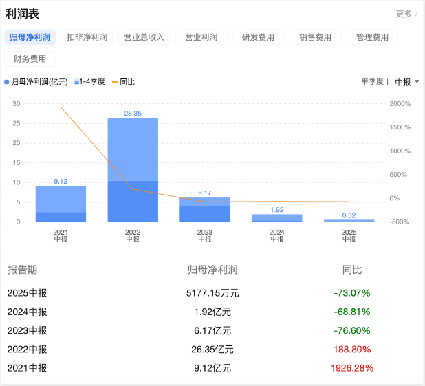 然而,2025年上半年,和邦生物交出了一份令人担忧的成绩单。半年报显示,公司实现营业收入39.21亿元,同比下降19.13%;归母净利润同比暴跌73.07%。