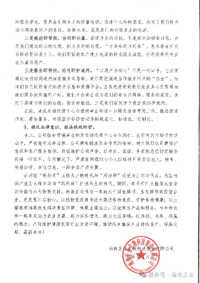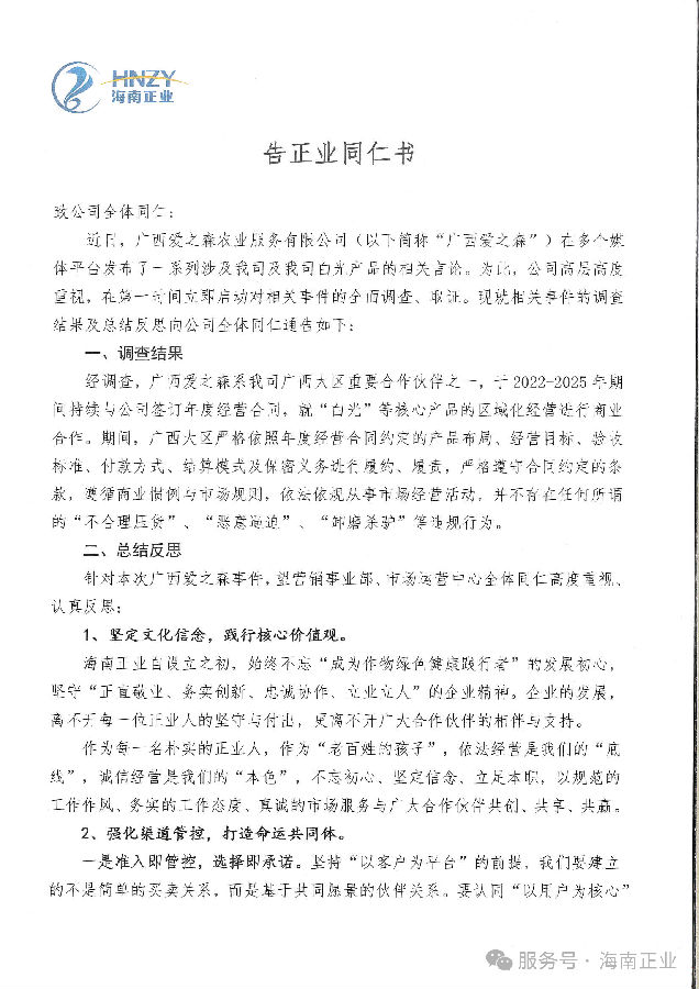 3月6日,海南正业发布声明,针对合作伙伴广西爱之森在媒体平台上的相关言论进行全面调查回应。厂家强调,不存在所谓的“不合理压货”“恶意逼迫”“卸磨杀驴”等违规行为。