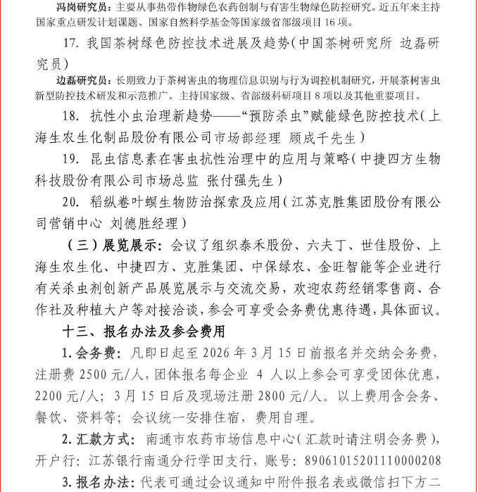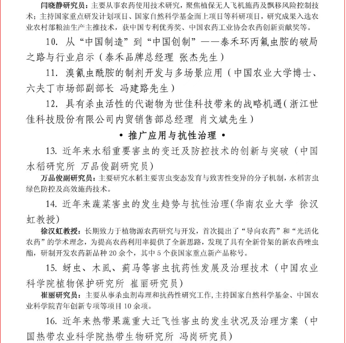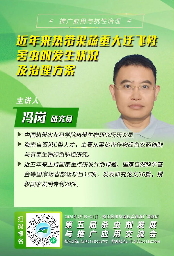 敬请报名参加“第五届杀虫剂发展与推广应用交流会”。届时,中国热带农业科学院环境与植物保护研究所冯岗研究员将带来“热带作物重要害虫精准防治技术研究”报告,聚焦防治痛点,通过“挖靶标、创绿药、配器械”,为芒果、豇豆等热带作物开出“精准处方”,真正实现“对症下药”,让虫子无处藏身,让果实安心成熟,让热带作物既绿色又丰产。