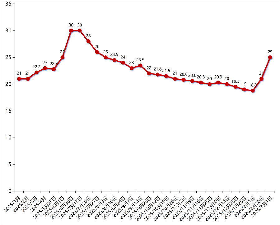 2025年—2026年3月1日国内氯虫苯甲酰胺原药价格走势(单位:万元/吨)