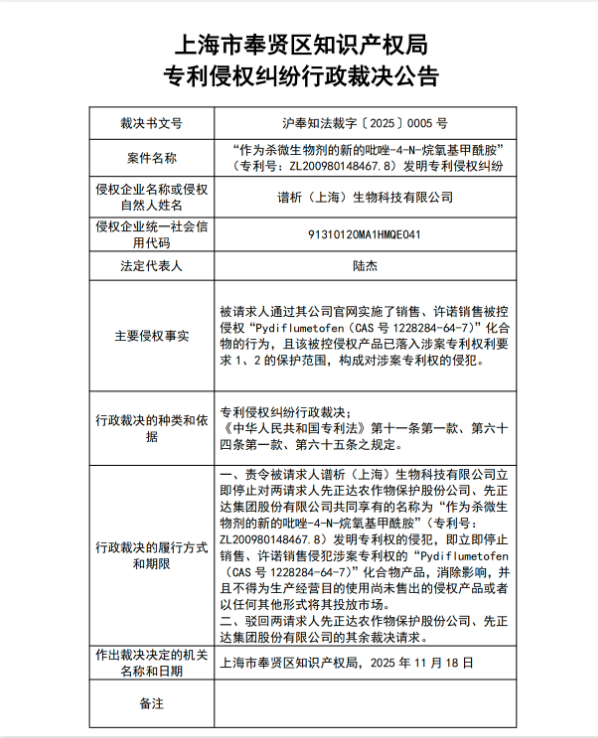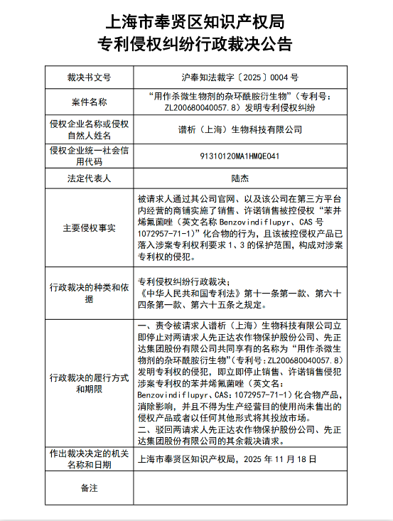 日前,上海市奉贤区知识产权局发布两份专利侵权纠纷行政裁决公告,认定谱析(上海)生物科技有限公司被认定侵犯先正达两项关键化学品发明专利。