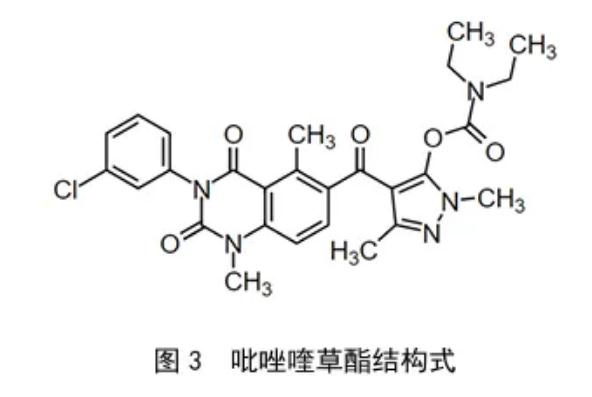 吡唑喹草酯(图3,英文通用名:pyraquinate;开发代号:CDH18119;商品名:道清扬)是基于喹唑啉二酮结构的苯甲酰吡唑类除草剂,不仅在喹唑啉二酮母体结构的基础上引入吡唑基团,而且在吡唑环的5-位上成功引入N,N-二乙基氨基甲酸基团,不仅提高产品生物活性,而且增加化合物的作物选择性。