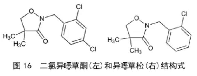 二氯异噁草酮(图16,英文通用名:bixlozone;开发代号:F9600;商品名:Isoflex、Overwatch、封趣等)是美国富美实公司开发的异噁唑啉酮类除草剂,与公司上市的异草松仅差1个氯原子。