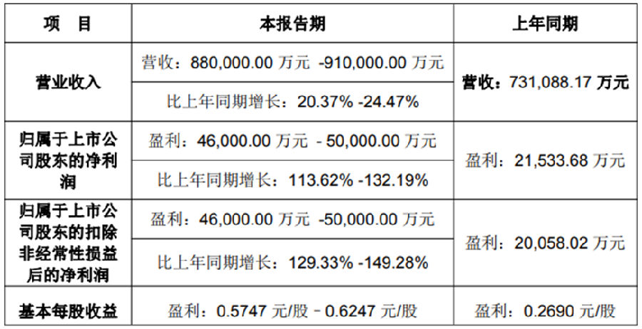 公司预计2025年实现营业收入88亿元至91亿元,同比增长20.37%-24.47%;归母净利润4.6亿元至5亿元,同比增长113.62%-132.19%;扣非净利润预计4.6亿元至5亿元,同比增长129.33%-149.28%;基本每股收益0.5747元/股-0.6247元/股。