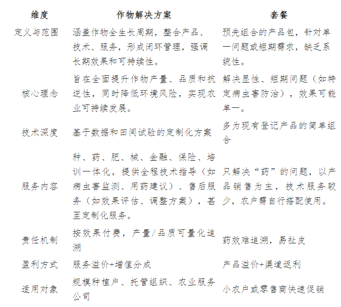 服务与技术:作物解决方案强调服务和技术支持,而套餐则更多是产品销售。套餐虽然方便,但缺乏灵活性,无法根据作物生长的动态变化进行调整,且容易被过度宣传和滥用。