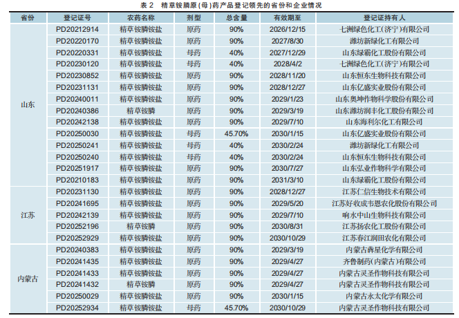 日本明治制果药业株式会社于2014年11月3日在我国首先临时登记精草铵膦原药(总有效成分含量为90%),2017年、2018年各登记原药1个,2019年无原药登记,2020-2025年登记原(母)药产品1~20个不等。原(母)药产品中,93%含量1个,92%含量1个,91%含量1个,90%含量38个,88%含量1个,86.8%含量1个,83.2%含量1个,80%含量1个,45.7%含量7个,40%含量7个;低毒产品26个,中等毒33个;境外企业1家,境内企业34家(包括山东企业9家,江苏企业5家,内蒙古企业4家,湖北、浙江、四川企业各3家,湖南、安徽、甘肃、河北、黑龙江、宁夏、陕西企业各1家);PD农药54个,EX农药5个。精草铵膦原(母)药产品登记领先的省份和企业情况见表2。