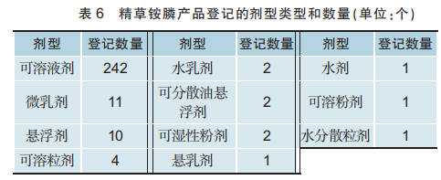 从剂型来看,共有11种剂型(见表6),可溶液剂(SL)的登记数量居第一,有242个,占比87.36%,随后微乳剂(ME)、悬浮剂(SC)的登记数量均超过了9个。由表6可知,符合农业高质量发展需求的绿色环保剂型农药较多。