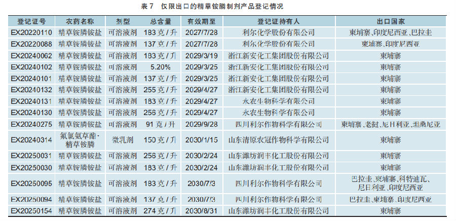 从仅限出口农药来看,国内企业已关注到精草铵膦制剂产品的出口业务,2022年7月29日,利尔化学股份有限公司登记137克/升精草铵膦铵盐可溶液剂,首开精草铵膦出口创汇先河,出口国家为柬埔寨,后于2025年7月4日,增加出口到印度尼西亚。目前,精草铵膦出口制剂产品15个;出口企业6家,四川、山东和浙江企业各2家。仅限出口的精草铵膦制剂产品登记情况见表7。
