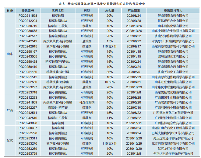 从生产企业来看,精草铵膦制剂产品的生产企业有172家,分布在我国21个省(直辖市、自治区)171家,其中山东省的企业数量41家,排名第一;后依次为广西区、安徽省、江苏省、河南省、四川省等地区,企业数量均超过了10家。除中国企业外,有一家日本企业也在精草铵膦制剂产品上进行了登记。精草铵膦及其复配产品登记数量领先的省份和部分企业情况见表8。