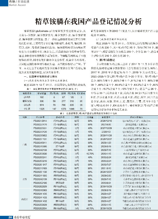 截至2025年12月31日,在我国登记有效期内的有机磷类除草剂有4种2840个(见表1),其中精草铵膦产品占总数的11.83%。