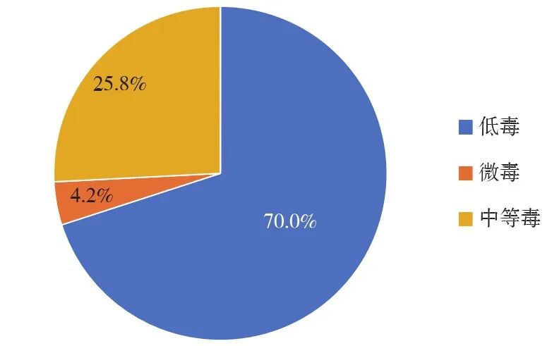 登记防治小麦蚜虫的农药产品中,低毒738个,占比70.0%;微毒产品44个,占比4.2%;中等毒产品272个,占比25.8%。登记产品以低毒和微毒为主,未有高毒产品(图2)。