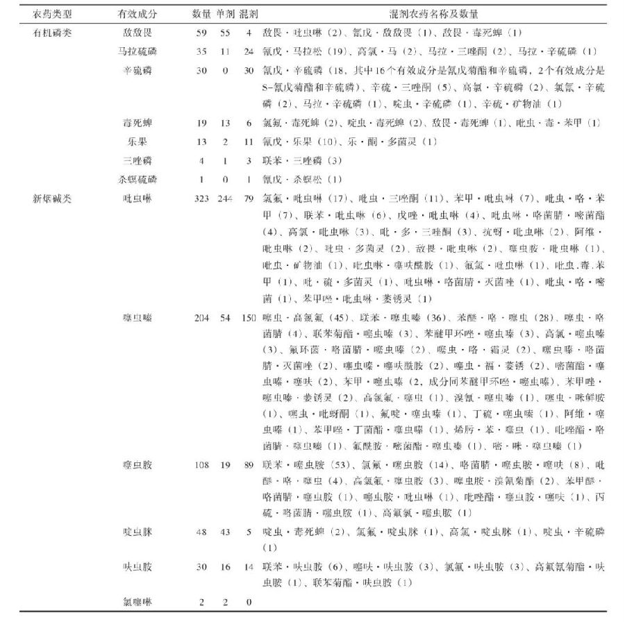 注:噻虫·高氯氟、高氯·噻虫嗪、高氯氟·噻虫有效成分相同;苯醚甲环唑·噻虫嗪、苯甲·噻虫嗪有效成分相同;联苯·噻虫嗪、联苯菊酯·噻虫嗪有效成分相同;联苯·呋虫胺、联苯菊酯·呋虫胺有效成分相同;氯氟·呋虫胺、高效氯氟氰菊酯·呋虫胺有效成分相同;氯氟·噻虫胺、高氯氟·噻虫胺有效成分相同。