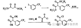 经典杜邦路线:以3-碘三氟甲基苯和丙二酸二甲酯通过偶联反应构建丙二酸骨架。