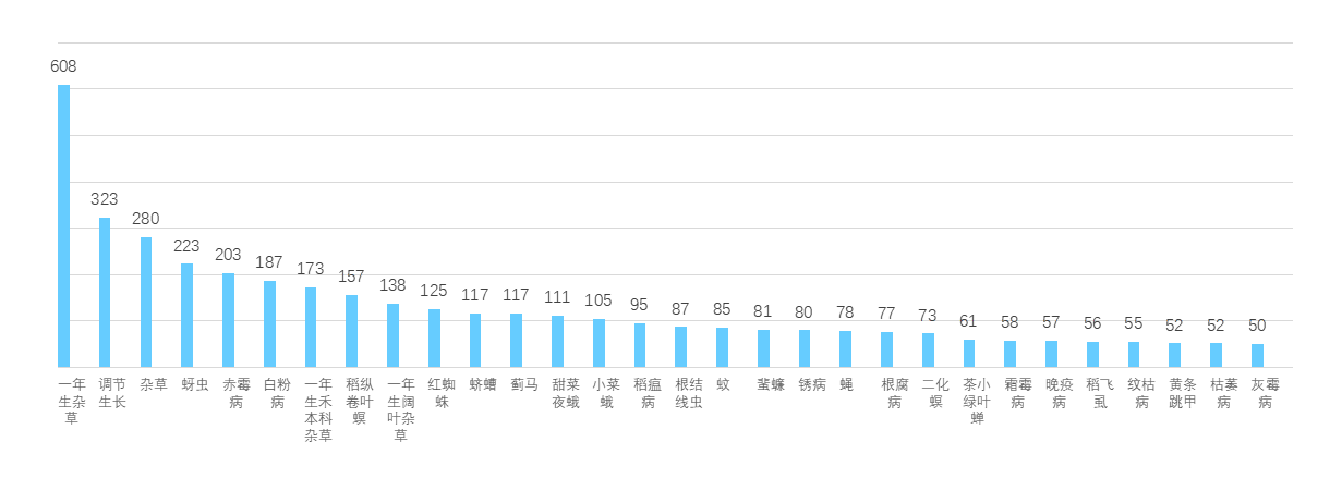 “一年生杂草”以608个登记数量断层第一,若叠加“禾本科/阔叶杂草”等细分项,除草板块是绝对的登记重心,竞争已呈红海之势。“调节生长”以323个产品高居第二,植物生长调节剂的需求稳步增长,侧面印证了农业从“高产”向“优质”转型的趋势。蚜虫、稻纵卷叶螟、红蜘蛛是企业的重点围剿对象。相比之下,病害靶标整体登记量偏低。除赤霉病、白粉病超过100个外,稻瘟病、纹枯病、霜霉病等大病害均集中在50-100区间,这意味着在病害细分赛道,仍有较大的差异化开发空间。