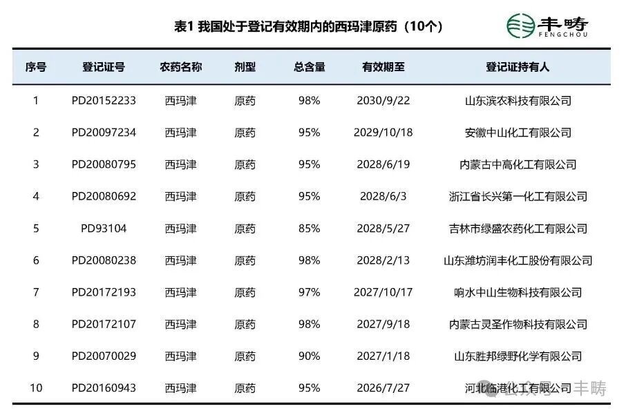 截至目前,我国处于登记有效期内的西玛津农药产品有18个,其中,原药登记数量为10个,单剂为8个,没有混剂。西玛津原药登记含量分别是85%、90%、95%、97%和98%,制剂剂型是可湿性粉剂、悬浮剂和水分散粒剂。