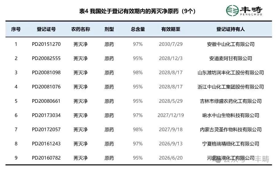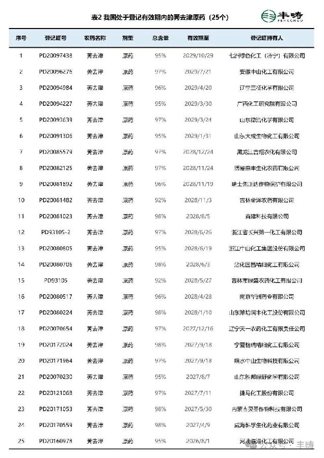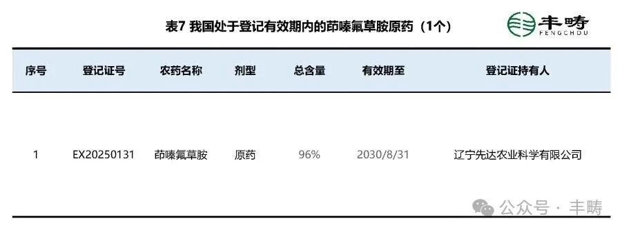 截至目前,我国处于登记有效期内的茚嗪氟草胺农药产品有1个,为96% 茚嗪氟草胺原药(仅限出口到柬埔寨)。