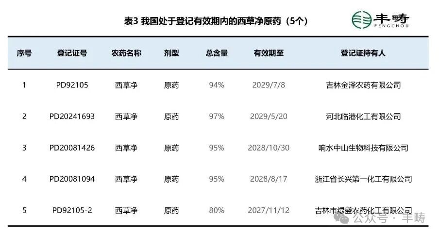 截至目前,我国处于登记有效期内的西草净农药产品有93个,其中,原药登记数量为5个,单剂为22个,混剂为66个(含三元复配)。莠去津原药登记含量分别是80%、94%、95%和97%,制剂剂型是可湿性粉剂、乳油、可分散油悬浮剂、微囊悬浮剂、水分散粒剂、颗粒剂和悬乳剂等。