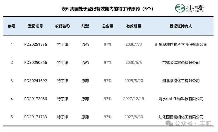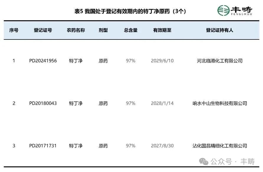 截至目前,我国处于登记有效期内的特丁净农药产品有5个,其中,原药登记数量为3个,单剂为1个,混剂为1个。特丁净原药登记含量均是97%,制剂剂型是乳油和悬浮剂。