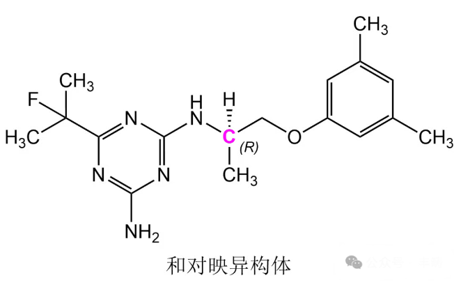 三嗪氟草胺的分子式C17H24FN5O,相对分子质量333.404,化学名称为2-N-[(2R)-1-(3,5-二甲基苯氧基)丙-2-基]-6-(2-氟丙-2-基)-1,3,5-三嗪-2,4-二胺。