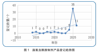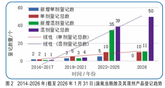 从制剂产品登记趋势上看,相比单剂产品登记,溴氰虫酰胺混剂产品登记总体呈快速增长态势(见图2)。尤其是2024-2026年(截至2026年1月31日)溴氰虫酰胺及其混剂登记产品数量分别为5个、46个,分别占单剂、混剂总数的50%、92%,年均登记数量分别为1个、15个。