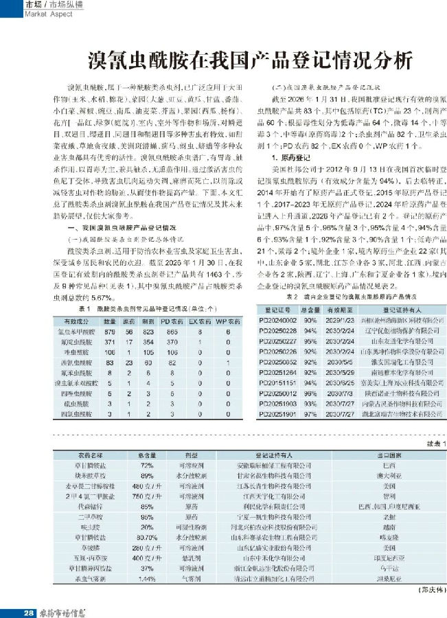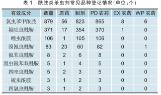 酰胺类杀虫剂,适用于防治农林业害虫及家庭卫生害虫,深受城乡居民和农民的欢迎。截至2026年1月30日,在我国登记有效期内的酰胺类杀虫剂登记产品共有1463个,涉及9种常见品种(见表1),其中溴氰虫酰胺产品占酰胺类杀虫剂总数的5.67%。