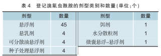 从登记剂型上看,共有7种剂型(见表4),悬浮剂(SC)的登记数量位居第一,有45个,占比为75%;紧接着悬乳剂(SE)、可分散油悬浮剂(OD)、种子处理悬浮剂(FS)均超过了3个。可以看出,符合环境友好型的剂型较多。