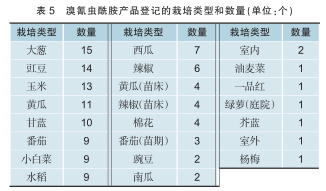 从登记作物/场所上看,溴氰虫酰胺产品登记在23种栽培类型(见表5)上。在大葱上登记数量最多,有15个,随后豇豆、玉米、黄瓜均超过了10个。其中,有的溴氰虫酰胺的生产企业在甘蓝、辣椒上进行了登记,有的溴氰虫酰胺生产企业在番茄(苗期)、辣椒(苗床)、黄瓜(苗床)上进行了登记,还有的溴氰虫酰胺生产企业在杨梅、油麦菜、西瓜、豌豆、辣椒上进行了登记,杀虫饵剂(溴氰虫酰胺)生产企业在室内、室外上进行了登记;有的丁醚脲·溴氰虫酰胺生产企业在番茄、黄瓜上进行了登记,有的吡蚜酮·溴氰虫酰胺生产企业在一品红、南瓜上进行了登记,等等。
