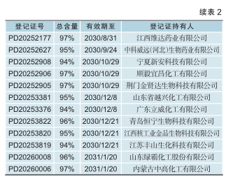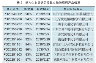 美国杜邦公司于2012年9月13日在我国首次临时登记溴氰虫酰胺原药(有效成分含量为94%),后去临转正,2014年开始有了原药产品正式登记,2015年原药产品登记1个,2017-2023年无原药产品登记,2024年后原药产品登记进入上升通道,2026年产品登记已有2个。登记的原药产品中,97%含量5个,96%含量3个,95%含量4个,94%含量6个,93%含量1个,92%含量3个,90%含量1个;低毒产品21个,微毒2个;境外企业1家,境内原药生产企业22家(其中,山东企业5家,湖北、江苏企业各3家,河北、江西、内蒙古企业各2家,陕西、辽宁、上海、广东和宁夏企业各1家)。境内企业登记的溴氰虫酰胺原药产品情况见表2。