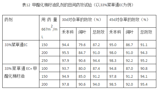 从表12可见,加入甲酯化棉籽油乳剂的桶混助剂,可以降低除草剂用量1/4~1/3;或在同等除草剂用量下课提高防效25%~35%。