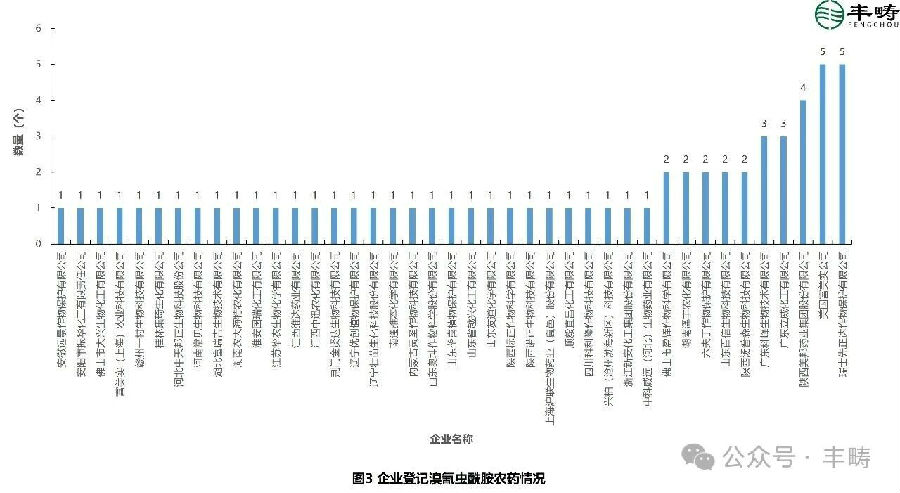 ——登记企业。由图3可知,溴氰虫酰胺农药登记产品数量在 2 个及以上的企业有10家,其余登记产品数量均为1个。其中,瑞士先正达作物保护有限公司和美国富美实公司登记产品数量最多,均为 5 个;陕西美邦药业集团股份有限公司登记产品数量为 4 个,广东立威化工有限公司和广东科峰生物技术有限公司登记产品数量均为3个,佛山市盈辉作物科学有限公司、湖南泽丰农化有限公司、六夫丁作物保护有限公司、山东百信生物科技有限公司和陕西汤普森生物科技有限公司登记产品数量均为 2 个。