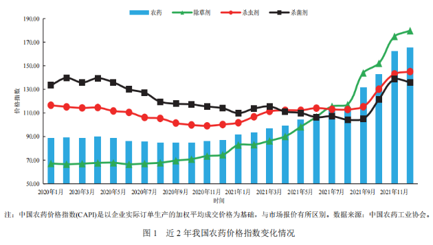 据中国农药工业协会统计,2021年,我国农药价格指数(CAPI)呈强势上涨势头,草甘膦、草铵膦、酰胺类等除草剂产品成交价格的持续上涨,是农药和除草剂价格指数保持正增长的主要驱动力,杀虫剂吡虫啉、啶虫脒价格上涨显著,杀菌剂戊唑醇等品种价格上涨显著。尤其是下半年以来,在能耗双控、限产限电的政策影响下,基础原材料价格大幅上涨,叠加安全事故时有发生、疫情散发、北方面临取暖季的开工率限制,多因素导致产品供应不足,原药价格持续高位,出现了农化市场延续近 10年来疯狂上涨的局面,主要原药产品价格基本达到了自2010年以来的新高,12月CAPI创历史新高,达到165.28(图 1)。