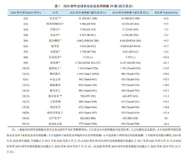 AgroPages发布了2020年全球农化企业TOP20榜单(表1),11家中国企业上榜,11家企业总销售额227亿美元,占据榜单销售总额的37%。